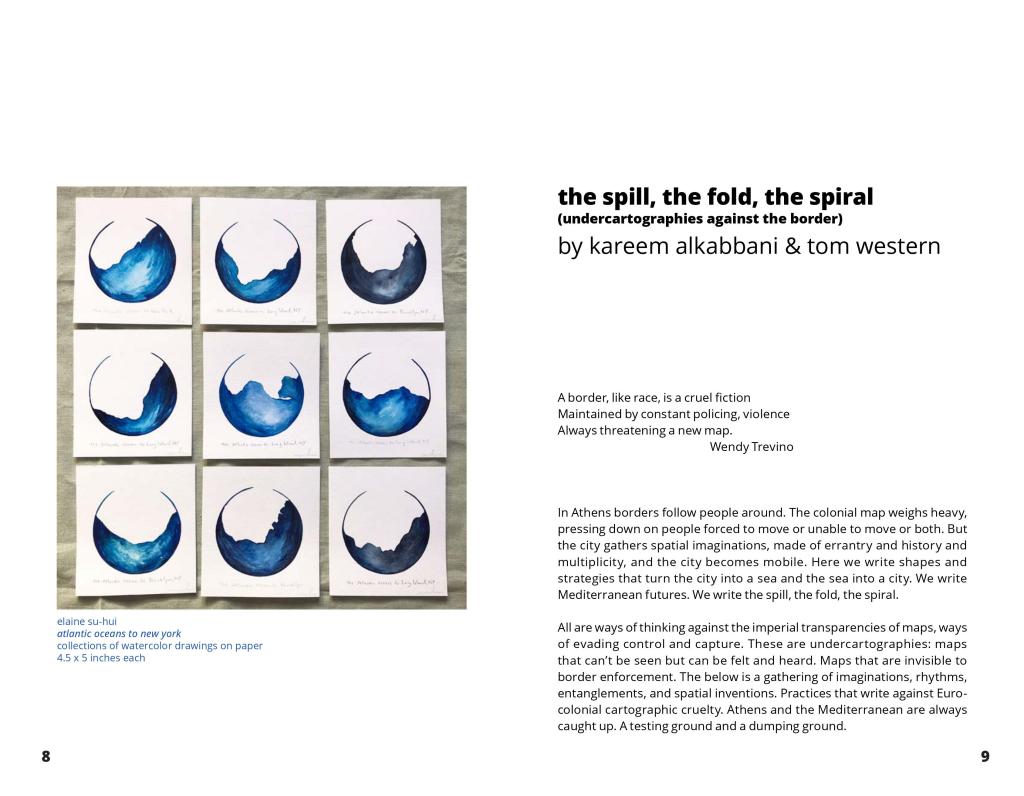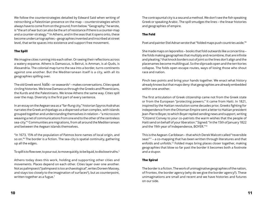In Athens borders follow people around. The colonial map weighs heavy, pressing down on people forced to move or unable to move or both. But the city gathers spatial imaginations, made of errantry and history and multiplicity, and the city becomes mobile. Here we write shapes and strategies that turn the city into a sea and the sea into a city. We write Mediterranean futures. We write the spill, the fold, the spiral.